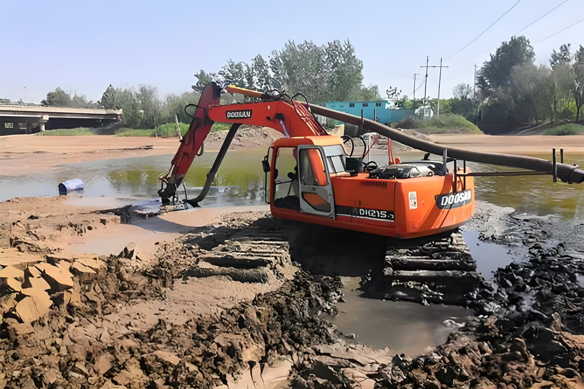 如果魚塘不想放水(比如里面還有魚苗,或者水源不好補(bǔ)充),就用 “水上挖機(jī)”。這種挖機(jī)底部有浮箱,能直接在水面上作業(yè)。